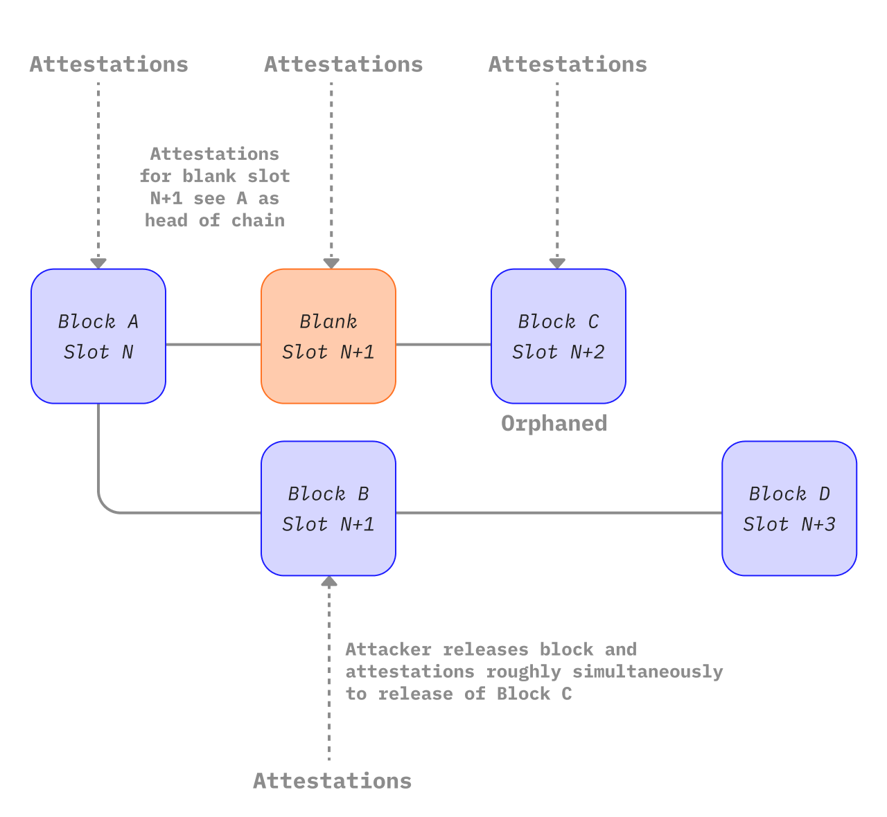 Several papers have explained attacks on Ethereum that achieve reorgs or finality delay with only a small proportion of the total staked ether. These attacks generally rely upon the attacker withholding some information from other validators and then releasing it in some nuanced way and/or at some opportune moment. They usually aim to displace some honest block(s) from the canonical chain. Neuder et al 2020 showed how an attacking validator can create and attest to a block (B) for a particular slot n+1 but refrain from propagating it to other nodes on the network. Instead, they hold on to that attested block until the next slot n+2. An honest validator proposes a block (C) for slot n+2. Almost simultaneously, the attacker can release their withheld block (B) and their withheld attestations for it, and also attest to B being the head of the chain with their votes for slot n+2, effectively denying the existence of honest block C. When honest block D is released, the fork choice algorithm sees D building on top of B being heavier than D building on C. The attacker has therefore managed to remove the honest block C in slot n+2 from the canonical chain using a 1-block ex ante reorg. An attacker with 34% of the stake has a very good chance of succeeding in this attack, as explained in this note. In theory, though, this attack could be attempted with smaller stakes. Neuder et al 2020 described this attack working with a 30% stake, but it was later shown to be viable with 2% of the total stake and then again for a single validator using balancing techniques we will examine in the next section.