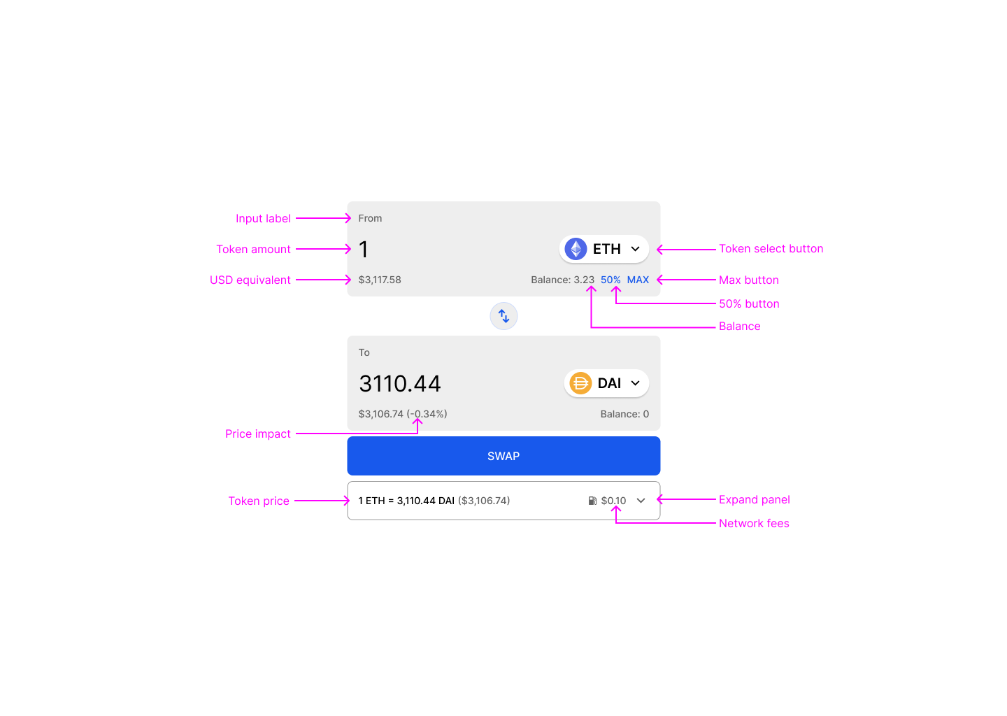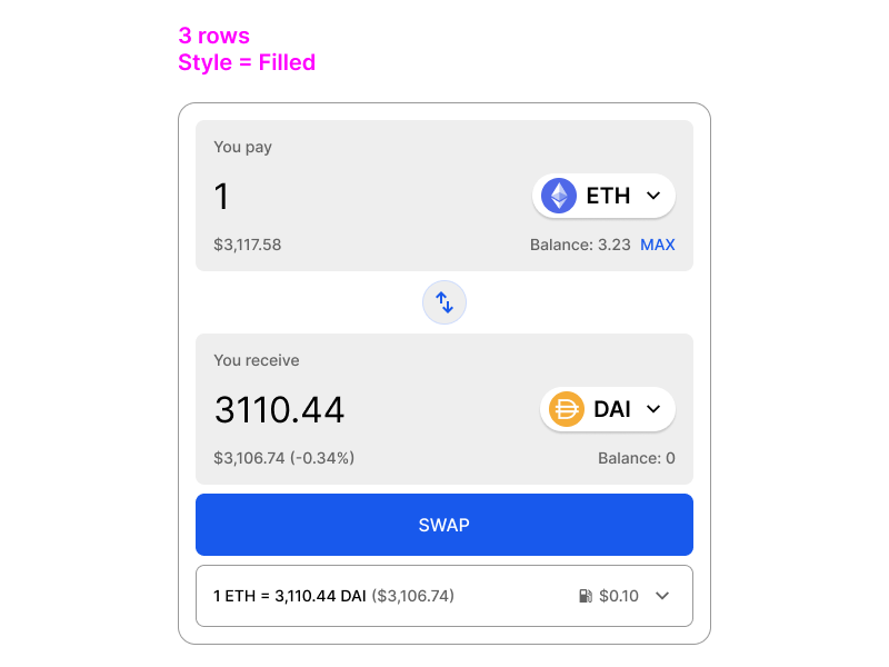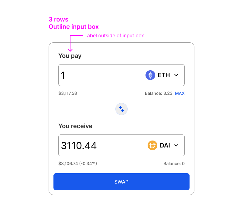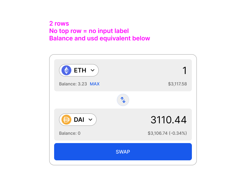 The button can also be mapped to the action that needs to be performed. For example, if the user cannot swap because they are on the wrong network, the button should say “switch to Ethereum”, and when the user clicks on the button, it should switch the network to Ethereum. This speeds up the user flow significantly.