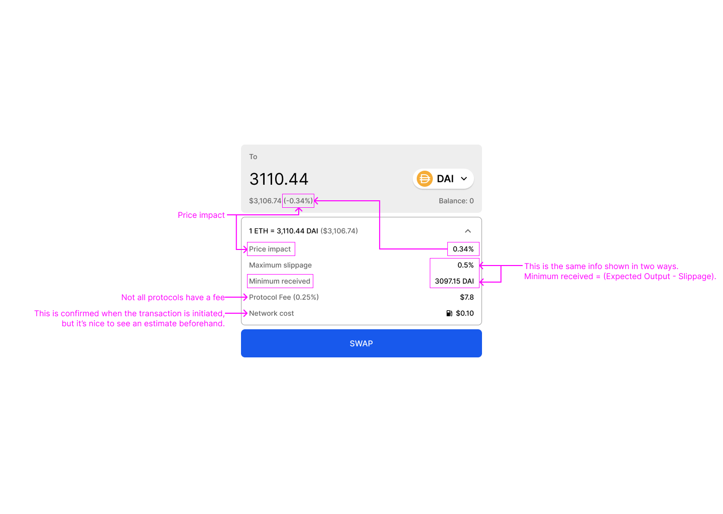 Some other details are simply restating the same thing in different ways. For example “minimum received” and “slippage” are two sides of the same coin. If you have slippage set at 1%, then the minimum you can expect to receive = expected output-1%. Some UIs will show expected amount, minimum amount, and slippage… Which is useful but possibly overkill.